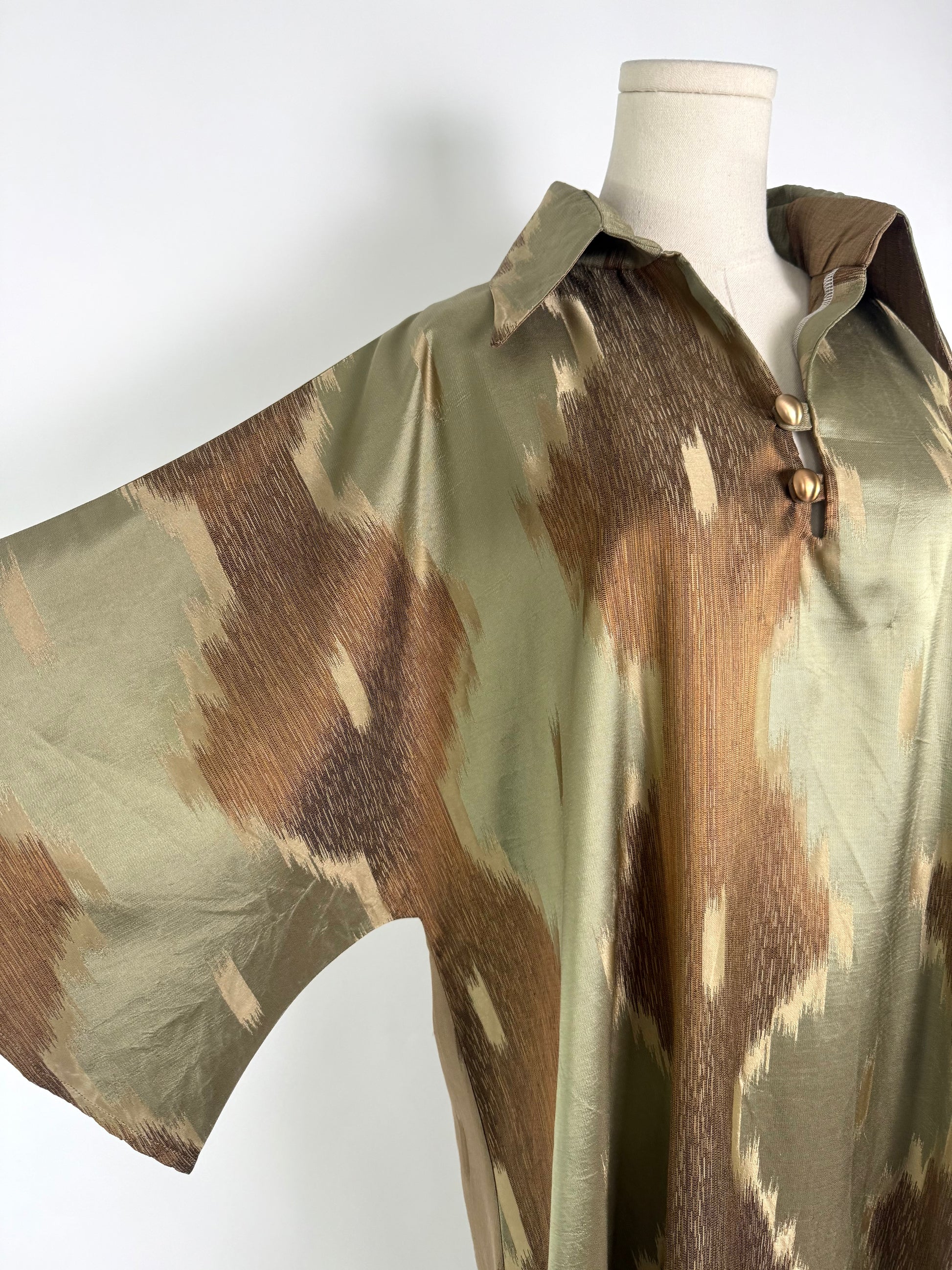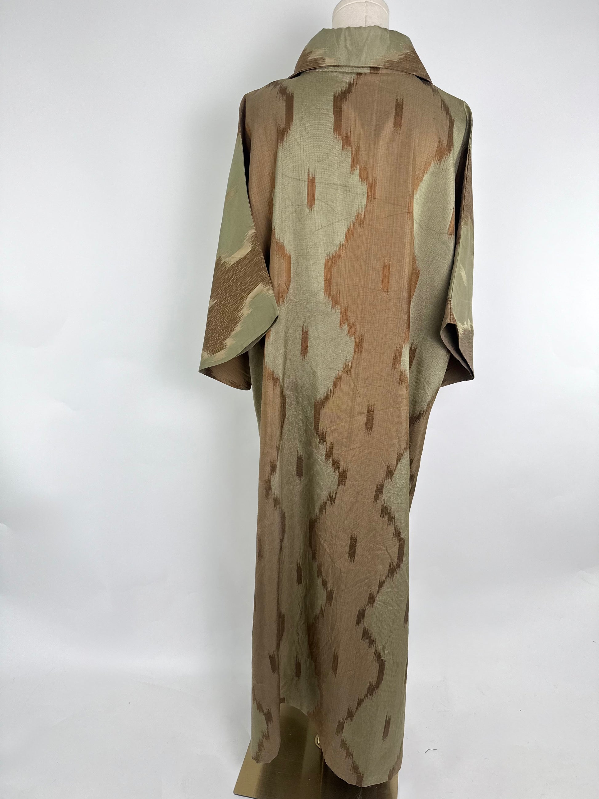 Crafted from sustainably sourced vintage silk, this one-of-a-kind caftan features an understated ikat pattern in a neutral color palette. Locally made in Kansas City, it showcases authentic vintage buttons and a refined collar detail. The upcycled construction honors both heritage textiles and environmental responsibility, making it a distinctive piece for the conscious collector who values artisanal craftsmanship and timeless elegance.