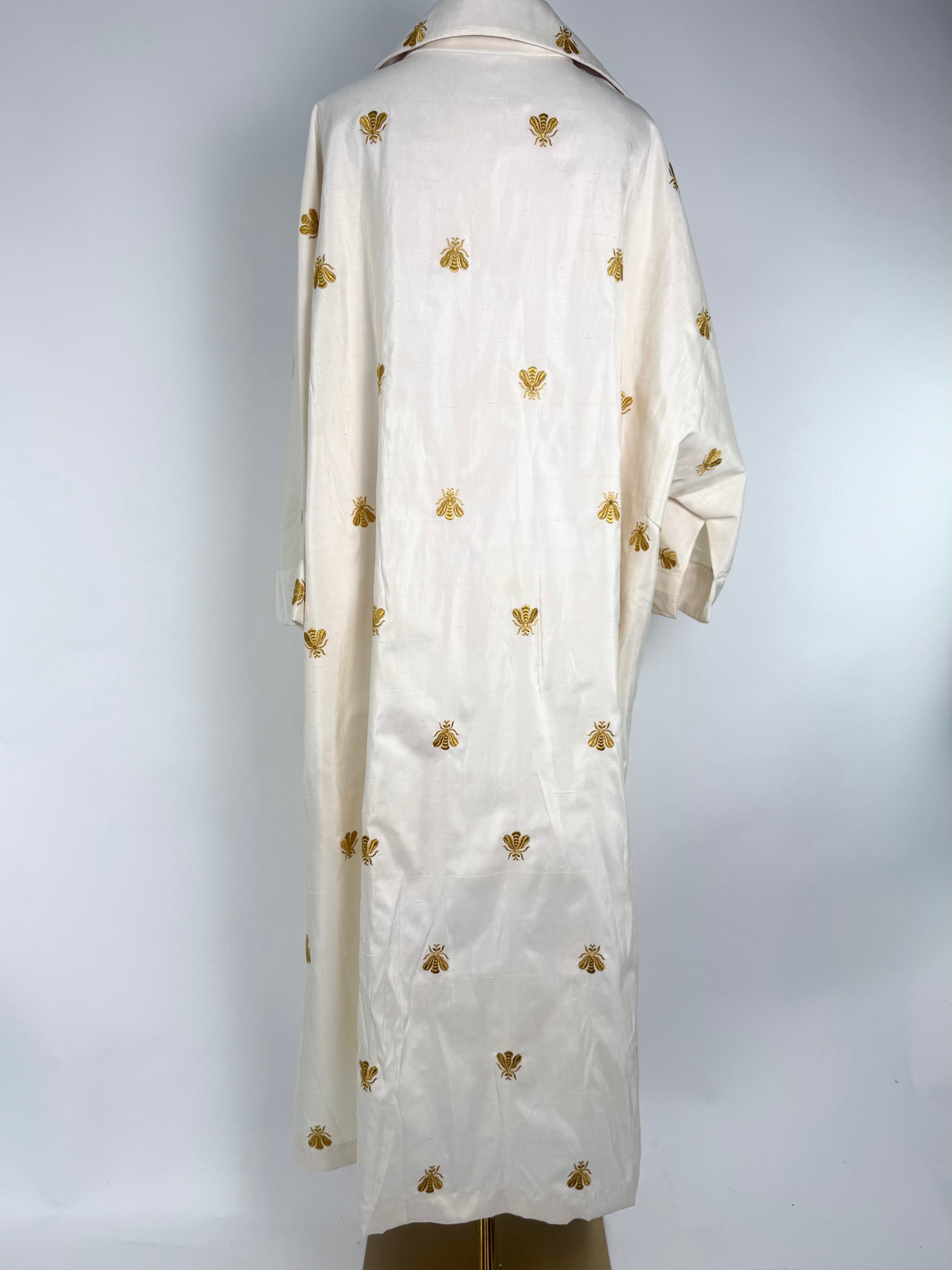 Elevate your wardrobe with this sophisticated caftan, meticulously crafted from upcycled vintage silk in Kansas City. This one-of-a-kind piece features an elegant white and gold palette, anchored by a striking vintage gold button at the collar. Each caftan is intentionally designed and handmade, celebrating the beauty of sustainable fashion through unique, artisanal construction. A timeless statement piece that honors both heritage materials and contemporary style.