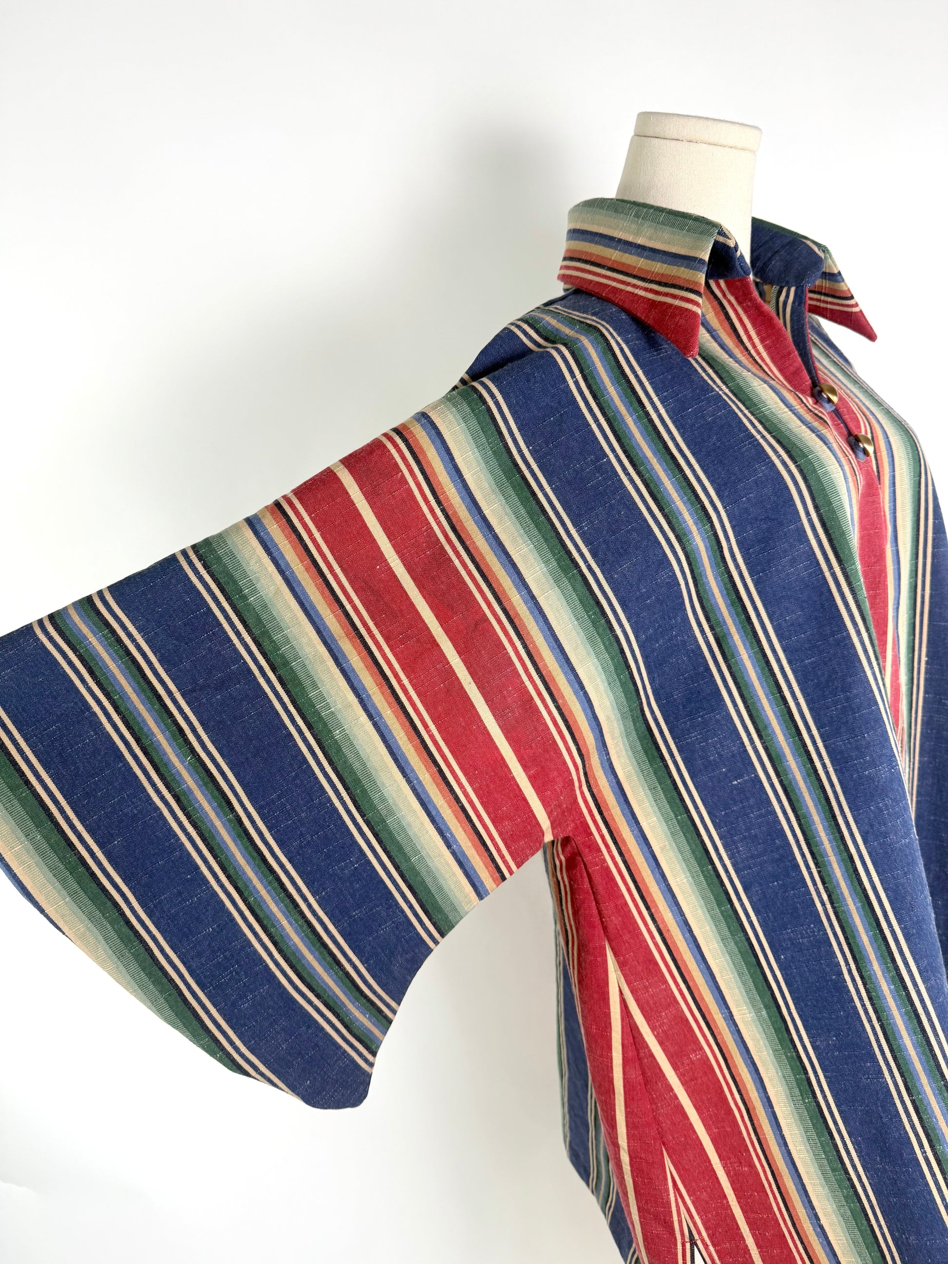 Crafted from vintage Ralph Lauren fabric, this one-of-a-kind mini caftan celebrates thoughtful upcycling and artisanal design. Handmade in Kansas City, it features an oversized collar, graceful flare sleeves, and authentic vintage buttons sourced with intention. Each piece honors sustainable fashion through intentional material selection, creating a sophisticated garment that's as unique as it is responsibly made.