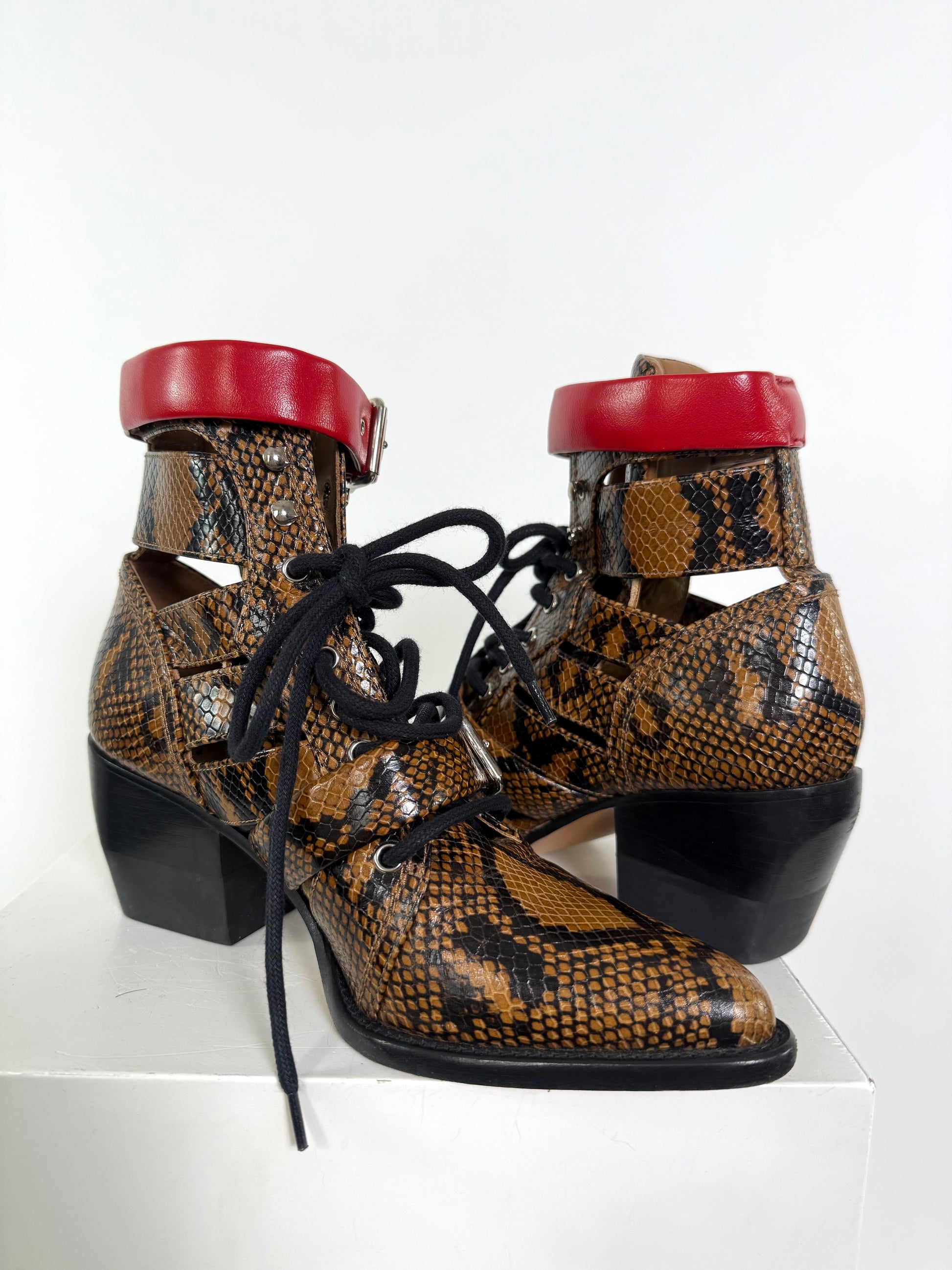 The Chloe Snake Print Boot delivers edge with elegance. Crafted in supple leather with a striking snake print and bold red accent, this short bootie commands attention with its daring cutout design. Perfect for those who refuse to blend in, it pairs effortlessly with everything from tailored trousers to evening wear. Chic, badass, and undeniably sophisticated—a statement piece that proves luxury doesn't require compromise.