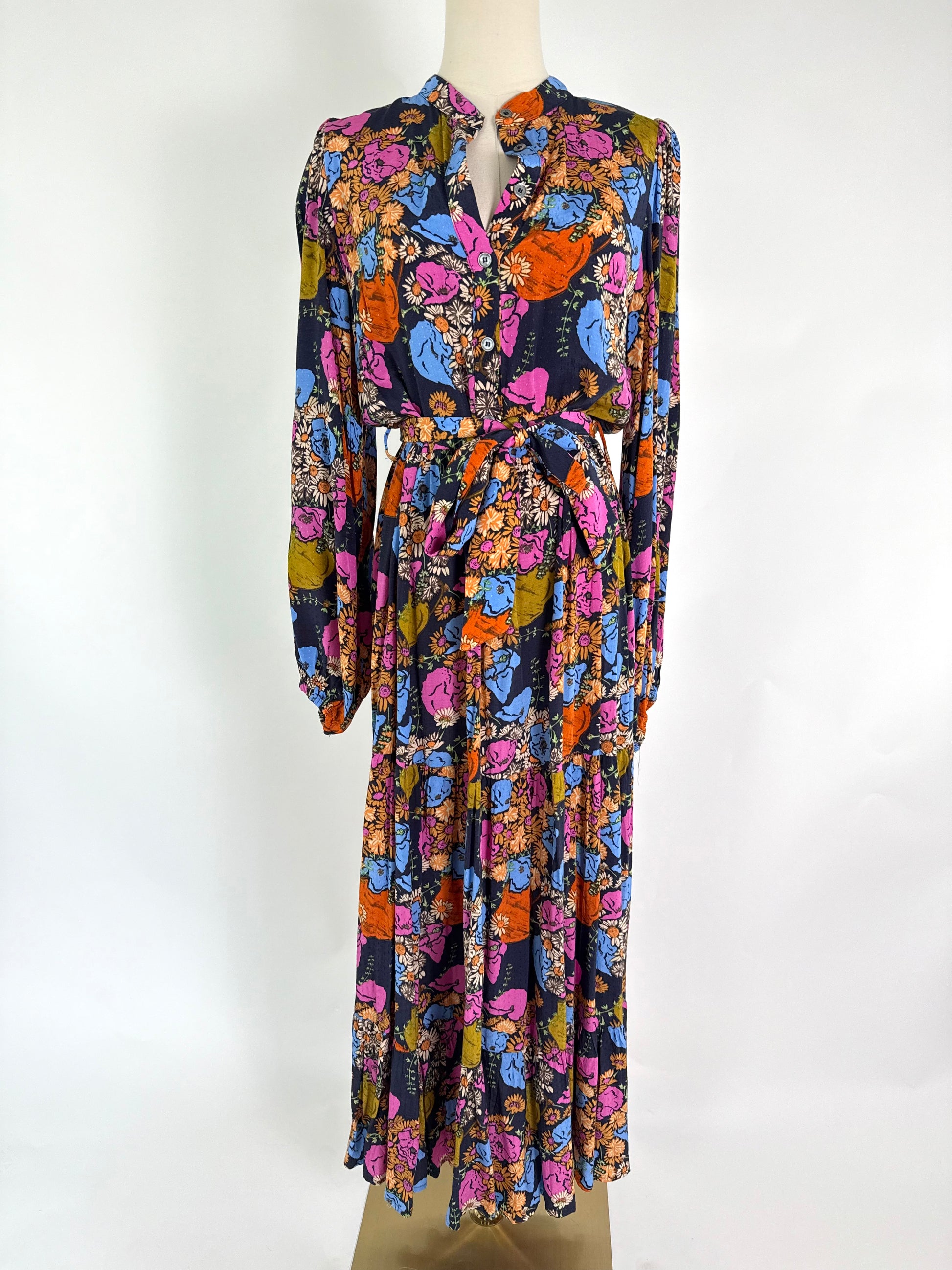 Elevate your wardrobe with the FRNCH Floral Maxi Dress, a sophisticated blend of playful charm and elegant design. This lightweight dress features a flattering button-up front and a tie waist that accentuates your silhouette. The delicate floral pattern and graceful drape create a refined yet effortless look, perfect for any occasion where style meets comfort.