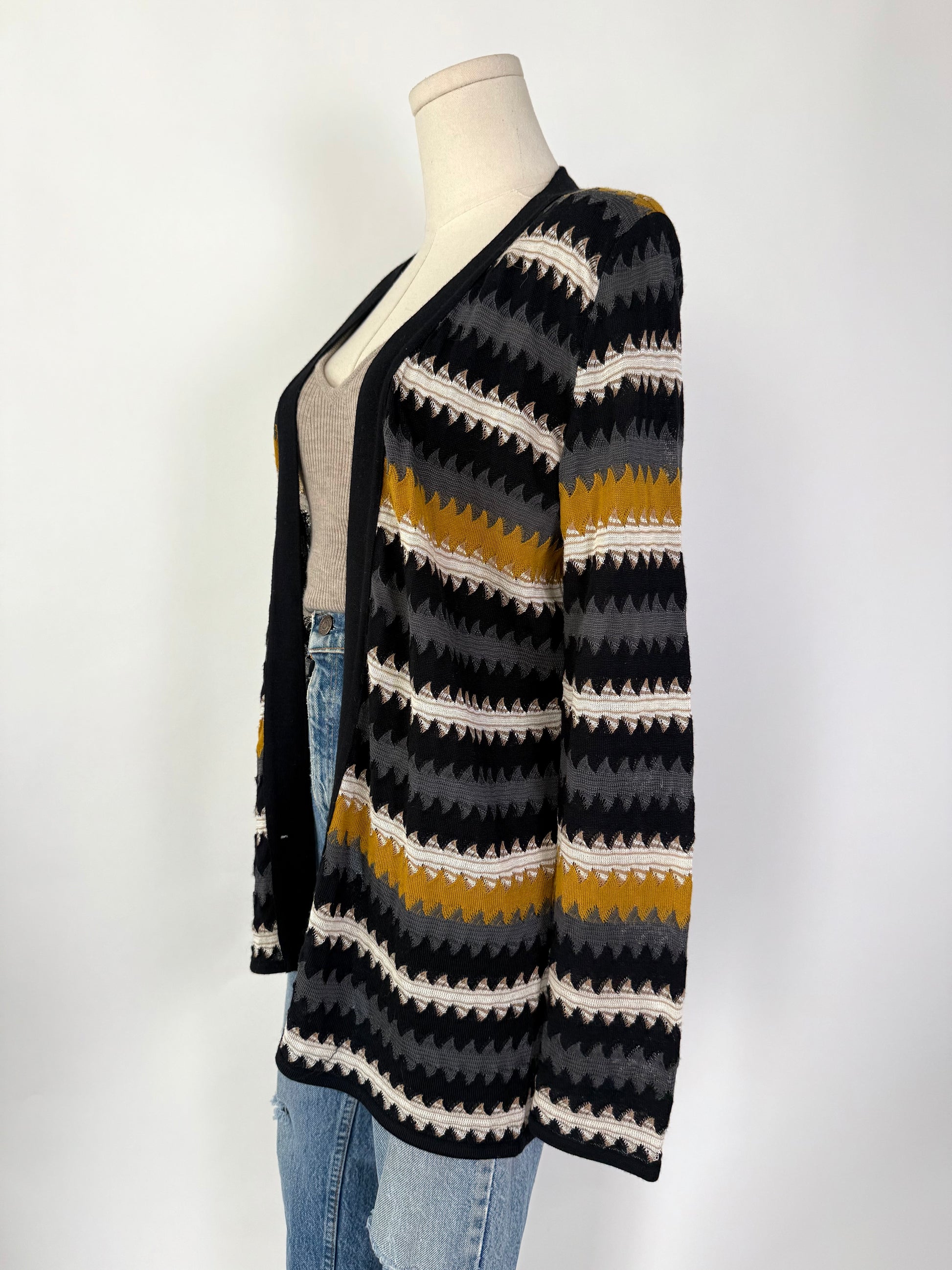 The Missoni Cardigan is a fall favorite that blends lightweight comfort with sophisticated style. Crafted from soft cotton, it features a subtle chevron zigzag pattern in neutral tones, offering timeless elegance and versatile layering for the season.