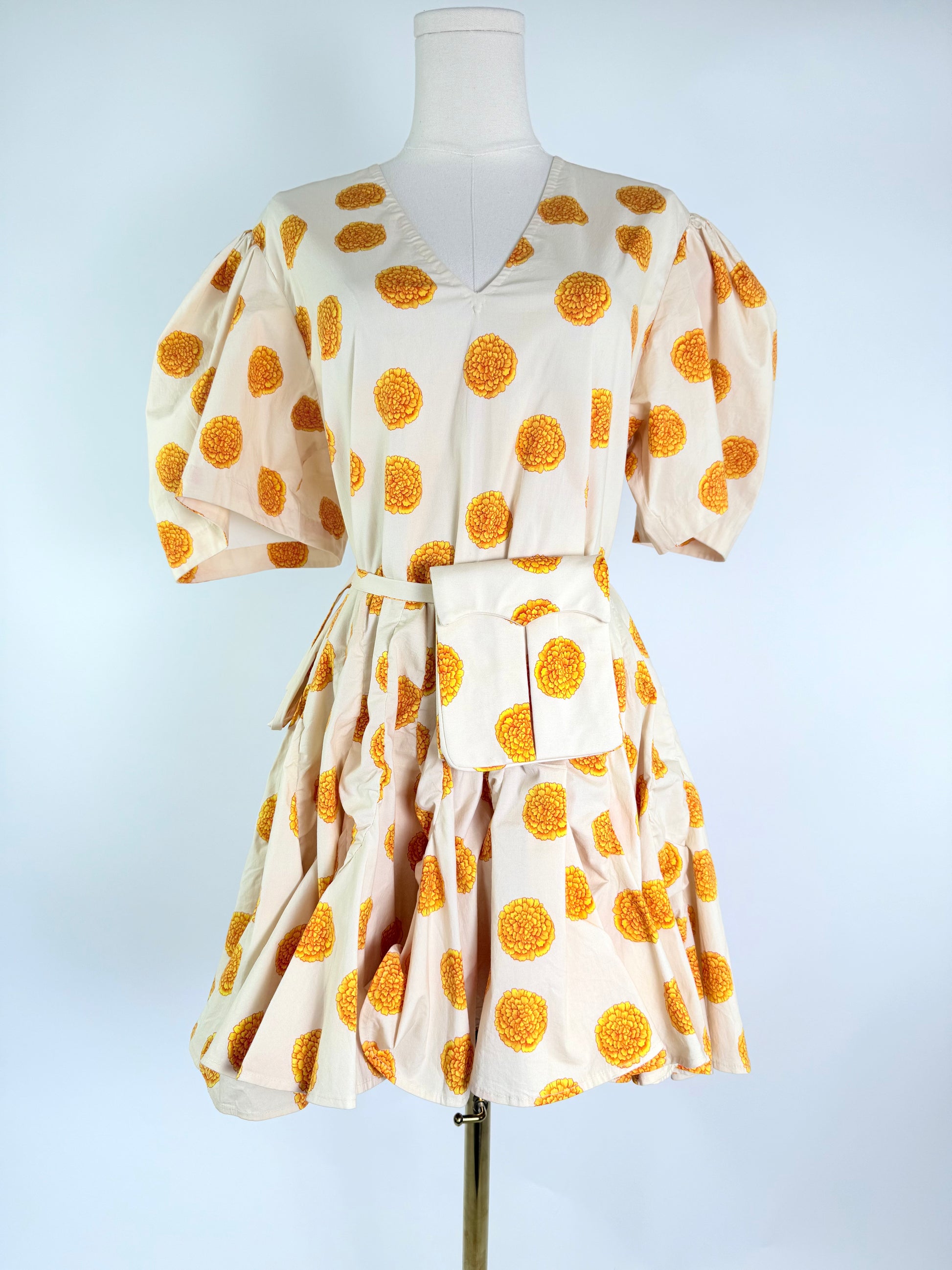 Crafted from soft cotton in a vibrant marigold hue, the Rhode Marigold Dress features elegant puff sleeves and a full skirt that moves gracefully. A removable belt bag adds a modern, functional touch, allowing you to carry essentials hands-free while maintaining a refined silhouette. Perfect for occasions where effortless sophistication is key.