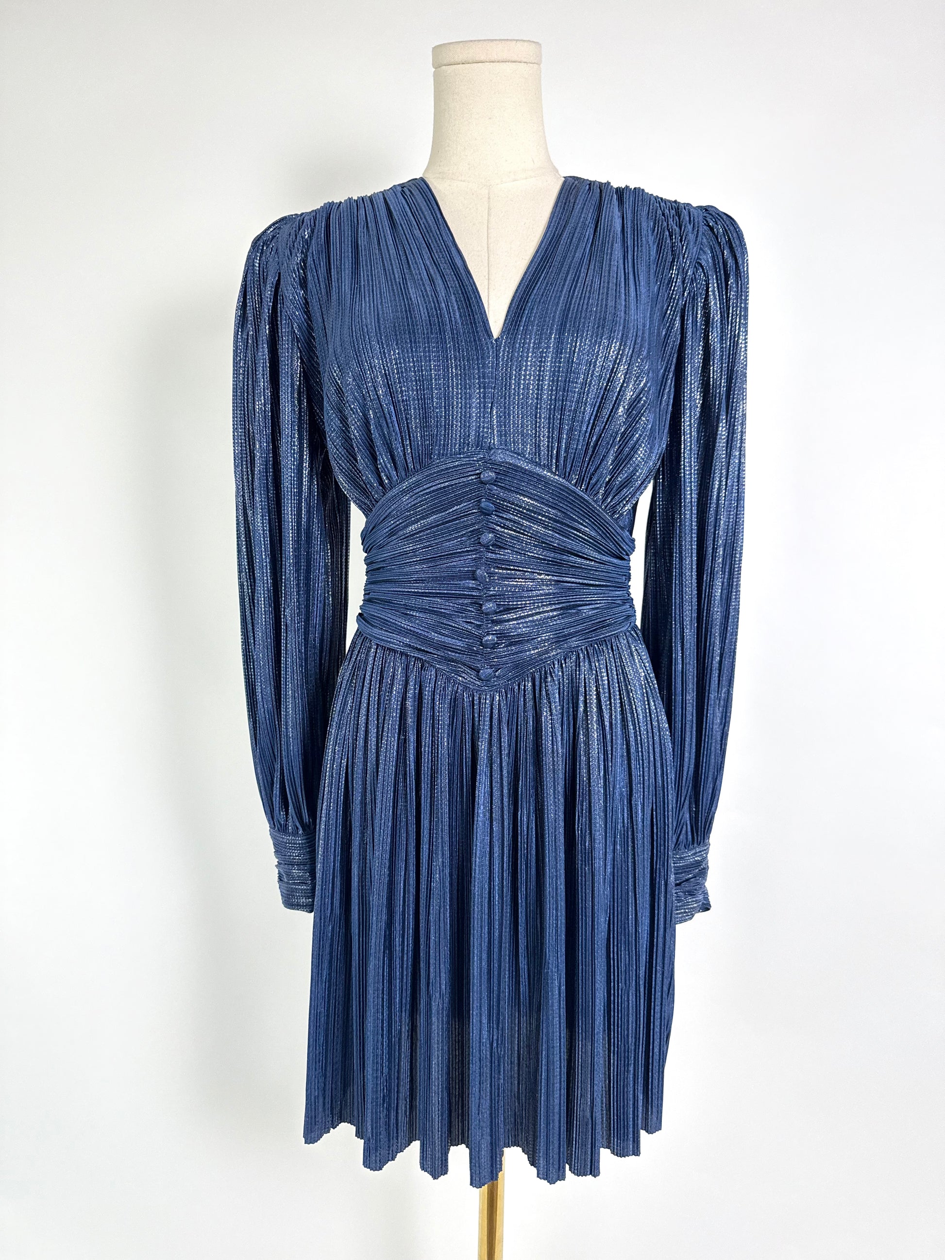 Elevate your evening with this stunning blue shimmer dress, designed for refined elegance. The tailored waist creates a flattering silhouette while long sleeves offer sophisticated coverage. Crafted with luxurious drape, this mini dress transitions seamlessly from cocktail events to upscale dinners. The subtle shimmer catches light beautifully, adding understated glamour to your wardrobe. A timeless piece that embodies modern luxury and impeccable style.