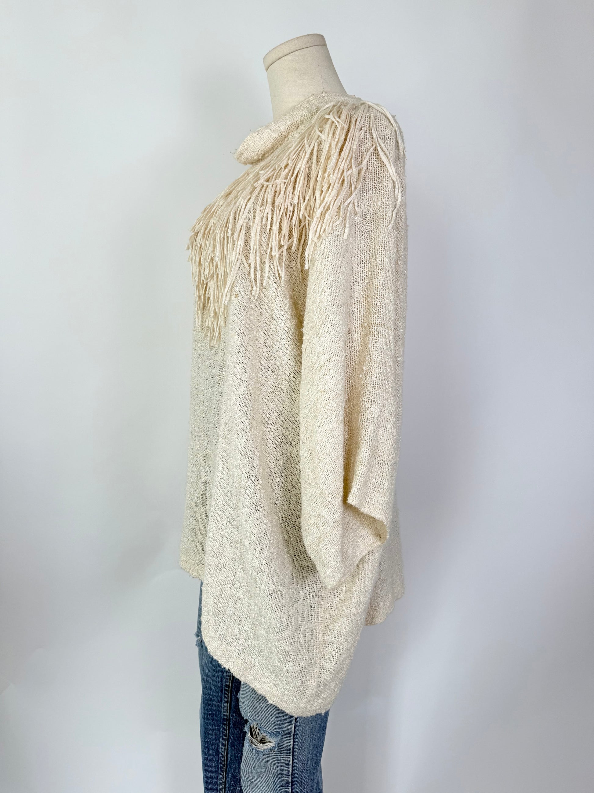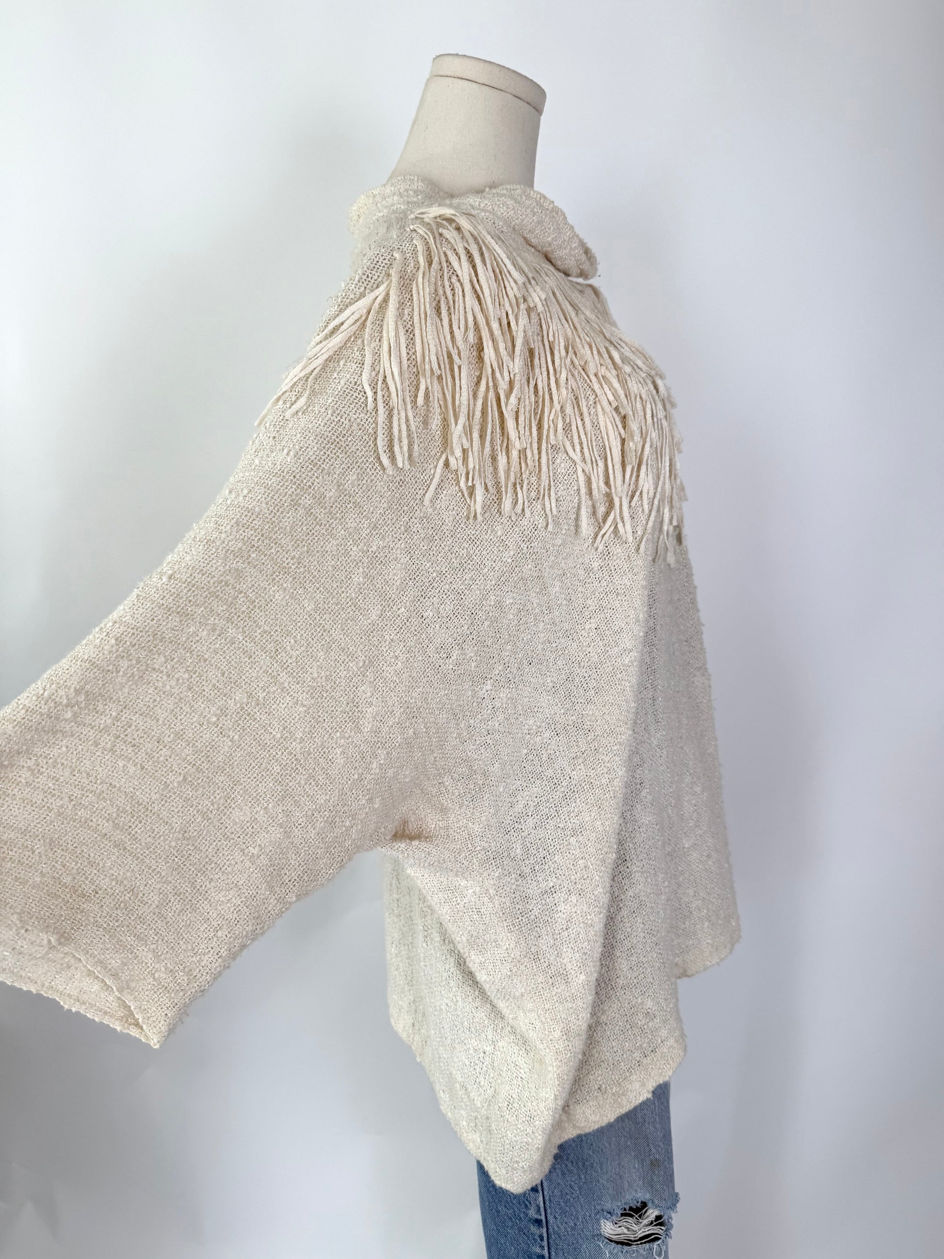 The Vintage Fringe Top offers a sophisticated take on retro style with its cream boucle fabric and delicate fringe neckline. Its wide silhouette and lightweight feel provide effortless elegance and comfort, making it a refined choice for a graceful, vintage-inspired look.