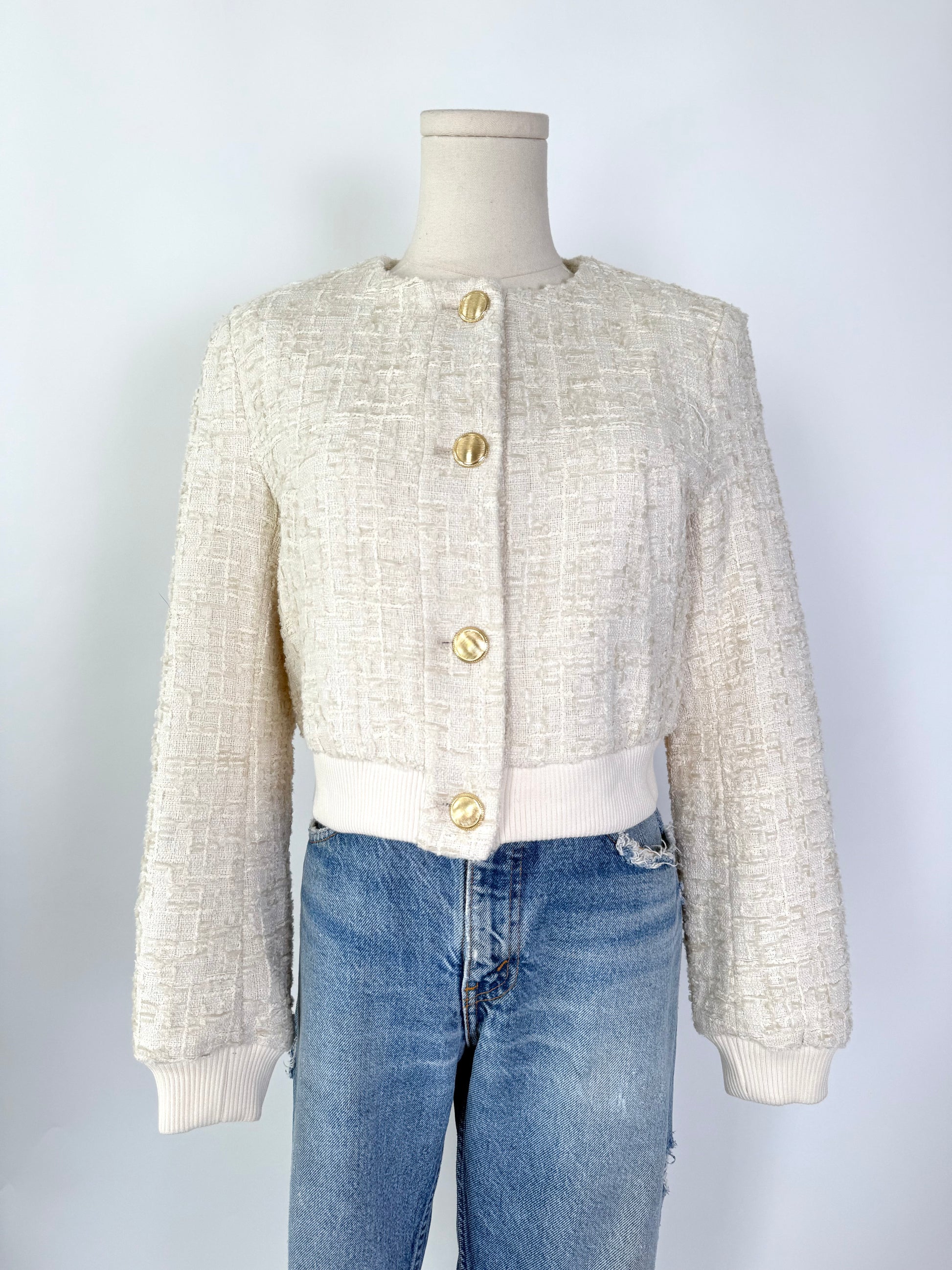 Elevate your wardrobe with this sophisticated cream boucle bomber jacket. Its textured fabric offers a refined, tactile appeal, while the cropped silhouette adds a modern edge. Accented with elegant gold buttons, this jacket seamlessly blends classic charm with contemporary style, perfect for polished, versatile looks.